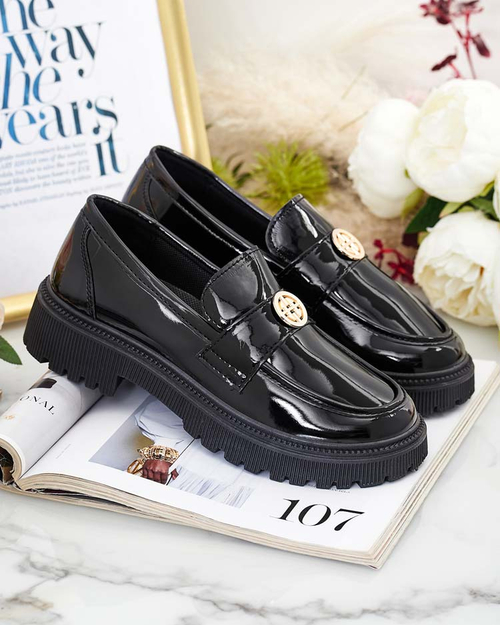 - Klasikiniai moteriški mokasinai storesniu padu. Pora pasiūta iš lakuotos odos, o vidpadis - medžiaginis. Puikiai tinka prie laisvalaikio aprangos!