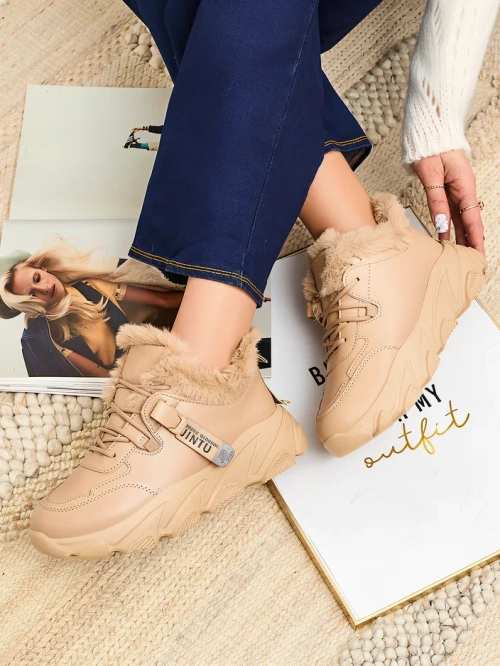 - Moteriški sportiniai bateliai storu padu. Viršutinė dalis su raišteliais, pagaminta iš eko odos. Vidus visiškai apšiltintas kailiu. Idealiai tinka prie sportinės aprangos!