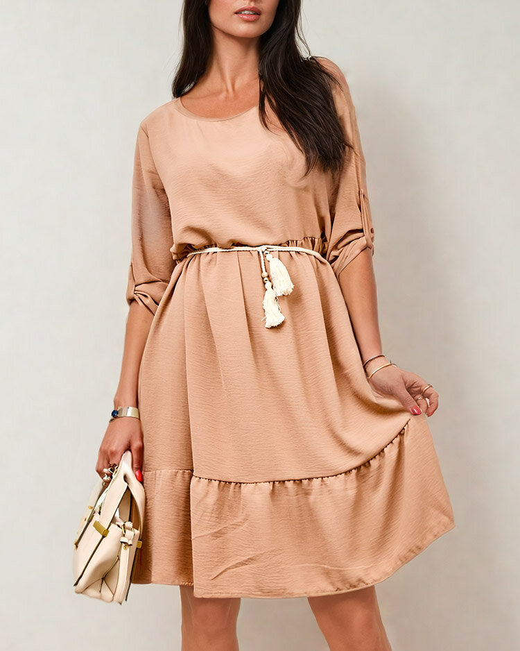 - Laisvalaikio stiliaus moteriška suknelė iki kelių su ilgomis, susiaučiamomis rankovėmis ir apvalia iškirpte. Be to, pridedamas diržas. Privaloma turėti šį sezoną! PASTABA: matavimo tikslumas (+/-) 1 cm. Matmenys matuoti plokščiai.