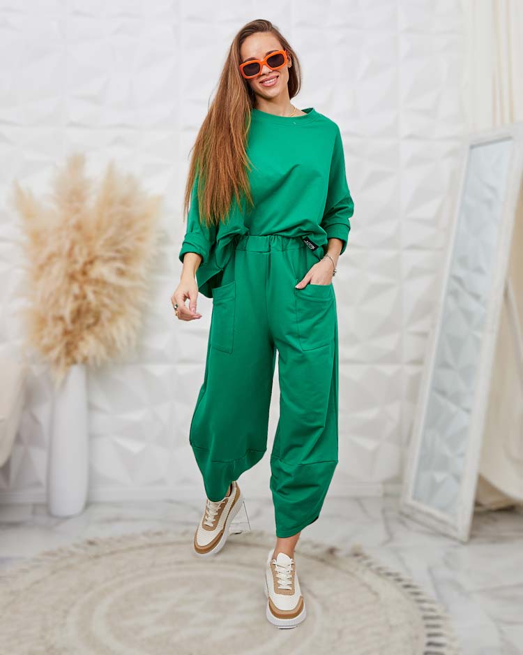 - Originalus moteriškas džemperių rinkinys, pagamintas iš malonaus audinio medžiagos. Džemperis ilgomis rankovėmis be gobtuvo. Šiluminės kelnės su elastiniu juosmeniu ir 2 kišenėmis.
