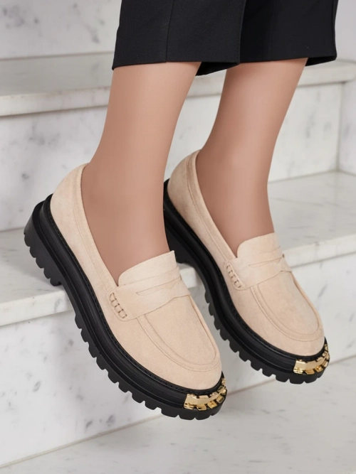 : Smėlio spalvos mokasinai yra šio sezono hitas, o jų universalus charakteris leidžia jiems būti puikiu priedu prie bet kurio garderobo. Jie patrauks dėmesį ir papildys bet kokį įvaizdį.