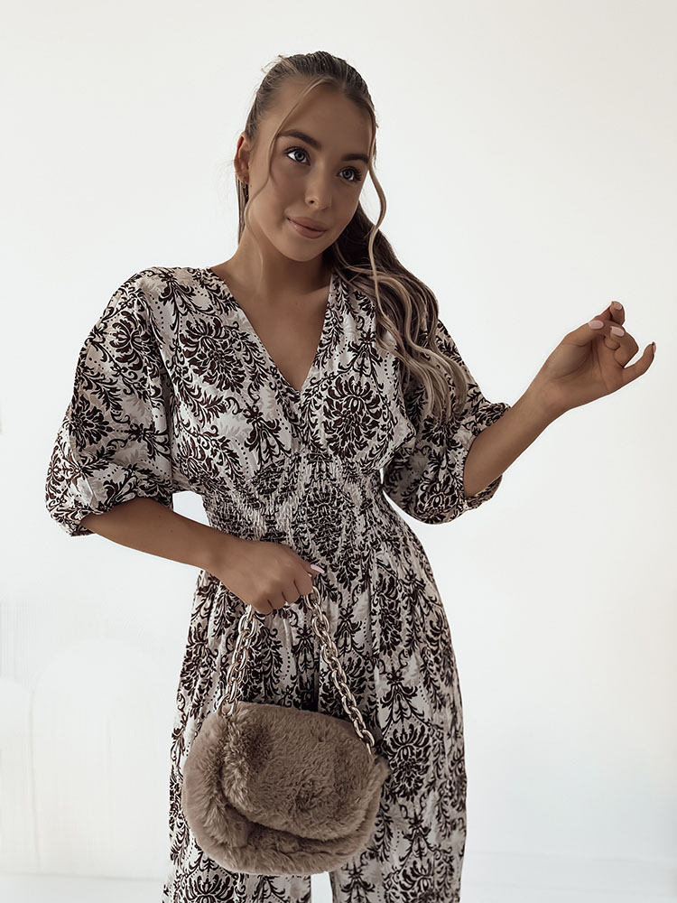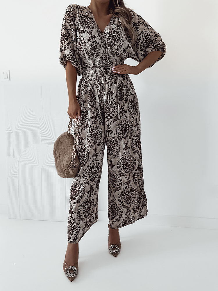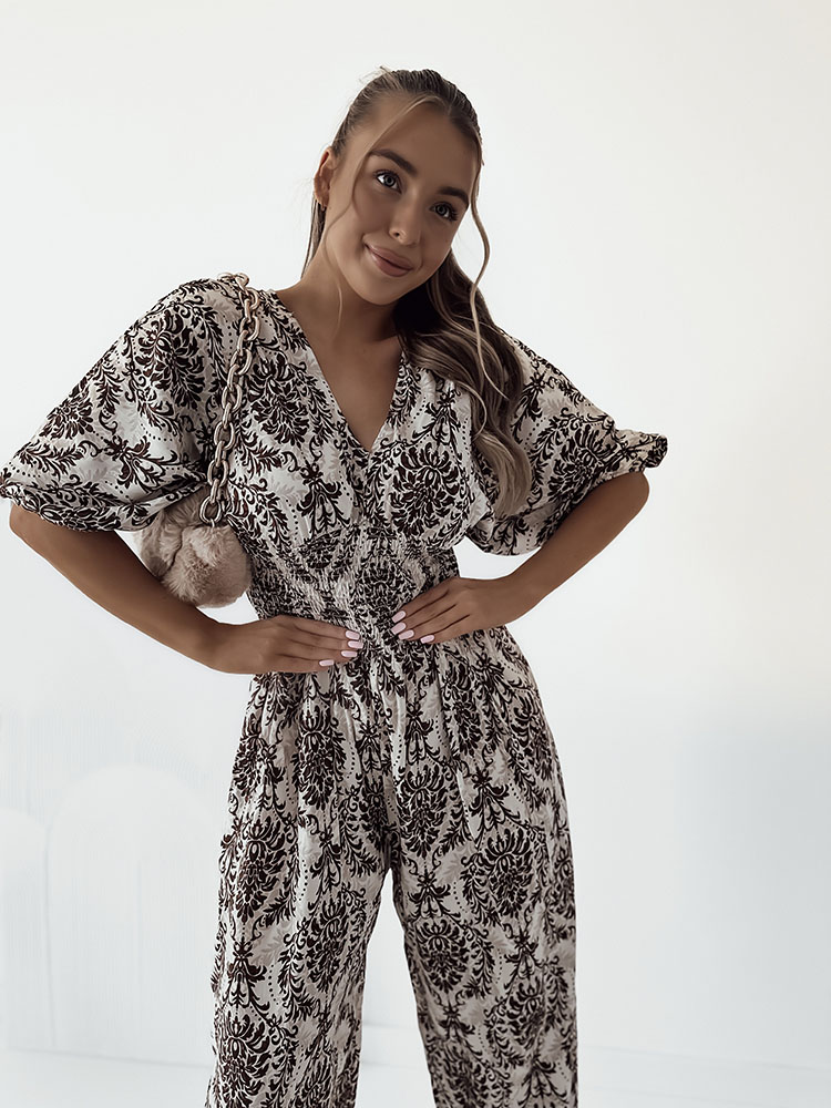 - Raštuotas moteriškas kombinezonas trumpomis rankovėmis. Modelis su V formos iškirpte ir elastiniu juosmeniu. Gaminys turi plačias, ilgas kojas.