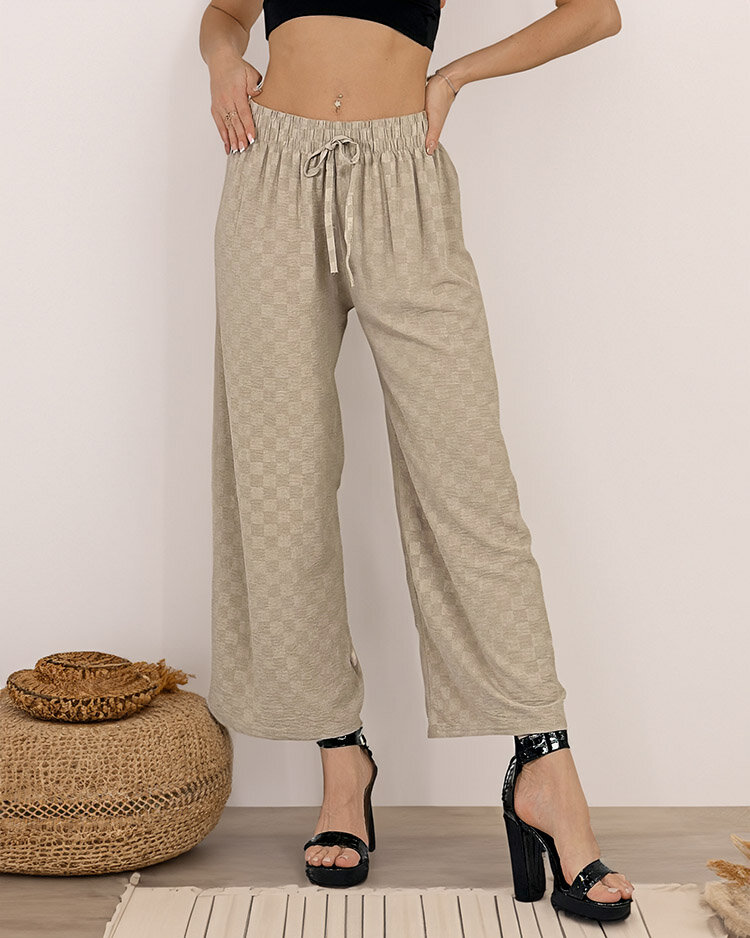 - Fenomenalios plačios kelnės, pasiūtos iš lengvo languoto audinio, modelis turi elastinę juostą ir raištelius juosmenyje. Šio sezono hitas! PASTABA: matavimo tikslumas (+/-) 1 cm.
