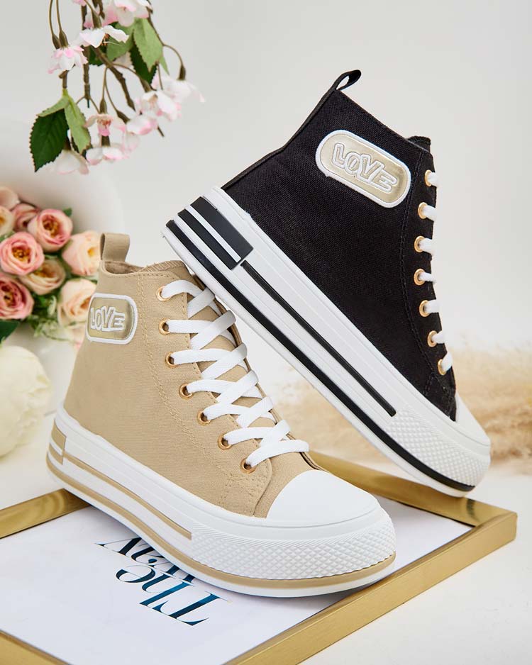 - Stilingi moteriški sportiniai bateliai iš audinio. Modelis ant patogios platformos. Viršutinė dalis suvarstoma raišteliais. Puikiai tinka kasdienei aprangai kurti!