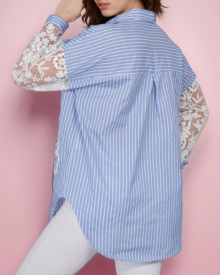 - Moteriški marškiniai ilgomis nėriniuotomis rankovėmis, dekoruoti dryžuotu raštu. Be to, blizgus lopas. Modelis užsegamas sagomis. Turi būti kiekvienos moters spintoje!