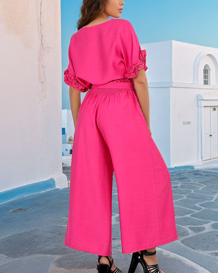 - Audinio komplektas su kelnėmis ir palaidine trumpomis rankovėmis su atvartu gale. Kelnės su elastiniu juosmeniu, plačiomis klešnėmis, turi 2 kišenes. PASTABA: matavimo tikslumas (+/-) 1 cm.