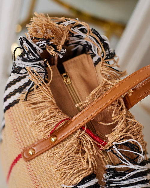 - Didelė moteriška rankinė, pagaminta iš austo audinio. Modelis turi 1 skyrių, užsegamas užtrauktuku. Puikiai tinka kiekvienai dienai arba paplūdimiui!