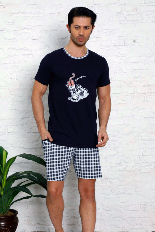 • Patogi vyriška dviejų dalių pižama trumpomis rankovėmis ir trumpomis klešnėmis, pasiūta iš medvilninio audinio. Modelis dekoruotas raštu. Puikiai tinka namų vakarams! PASTABA: matavimo tikslumas (+/-) 1 cm.