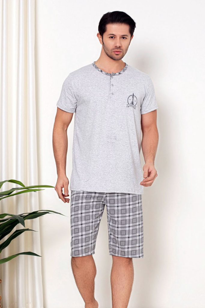 • Patogi vyriška dviejų dalių pižama trumpomis rankovėmis ir trumpomis klešnėmis, pasiūta iš medvilninio audinio. Modelis dekoruotas raštu. Puikiai tinka namų vakarams! PASTABA: matavimo tikslumas (+/-) 1 cm.
