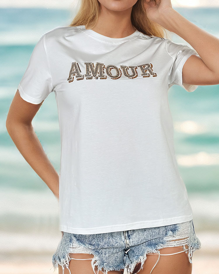 - Vienadieniai moteriški marškinėliai trumpomis rankovėmis ir apvalia iškirpte. Priekinė marškinėlių dalis dekoruota raštu kartu su blizgančiais blizgučiais ir cirkonais. PASTABA: matavimo tikslumas (+/-) 1 cm.