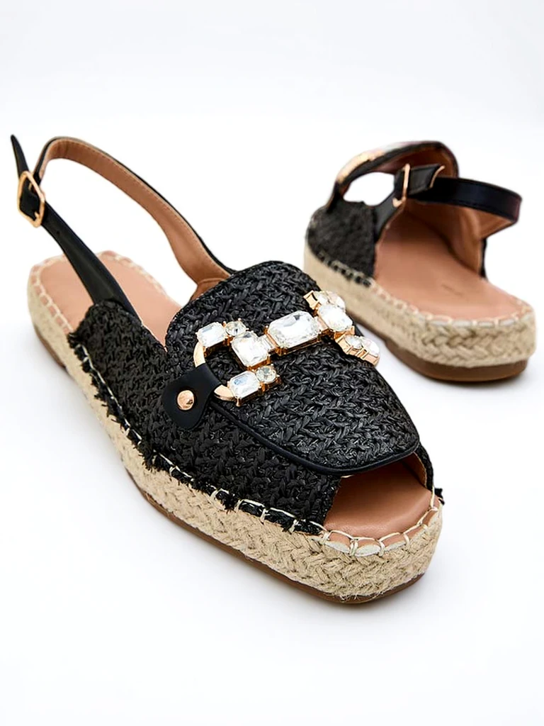 • Unikalios moteriškos espadrilės iš sintetinės medžiagos. Plokščias padas, dekoruotas džiuto virvele, suteikia patogumo. Slystantis modelis su odiniu dirželiu ir atvirais pirštais. Puikus vasaros aprangos priedas!