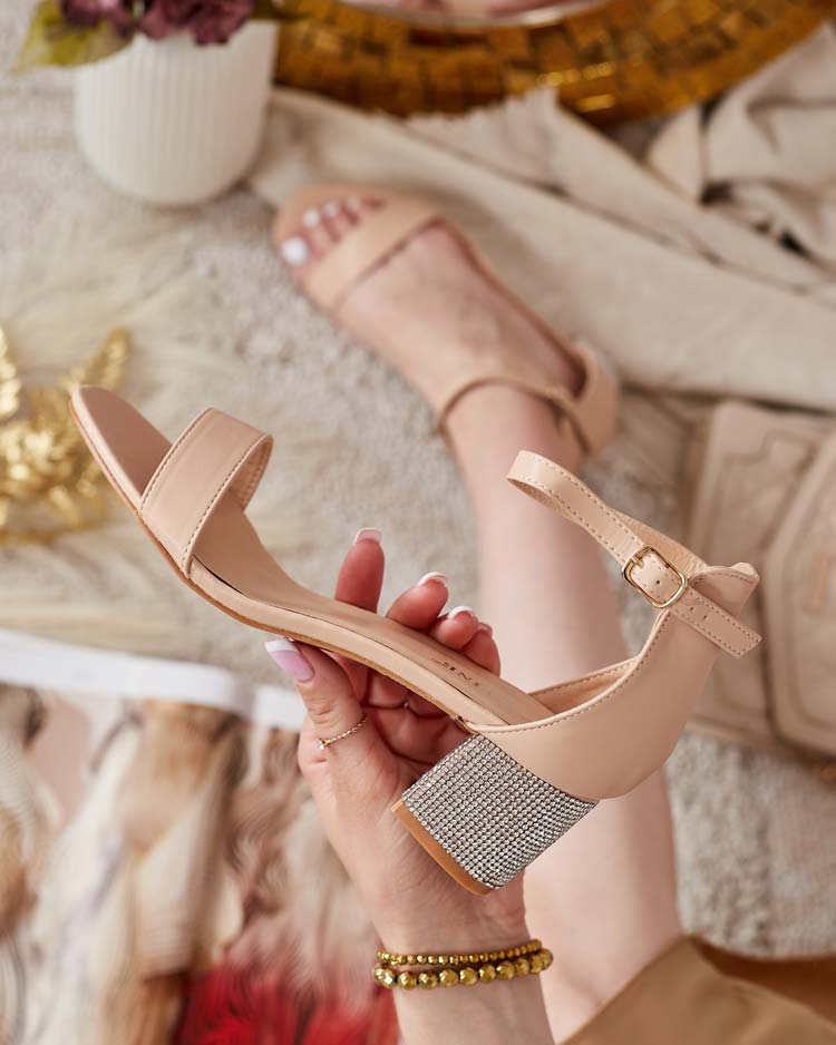 • Stiletto tipo sandalai iš eko odos, su eko odos vidpadžiu, užsegami sagtimi. Bateliai yra ant patogaus kulniuko, dekoruoto kubiniais cirkoniais, kurie suteikia kur kas daugiau komforto, o sagtis leidžia juos lengvai užsidėti.