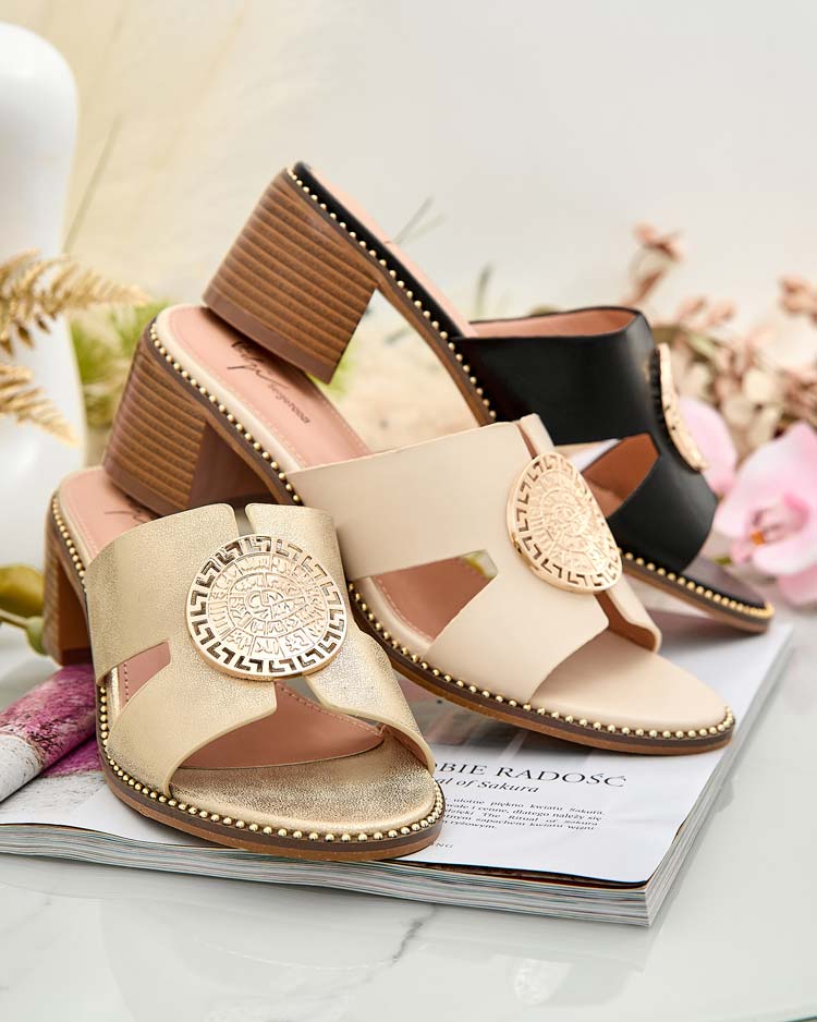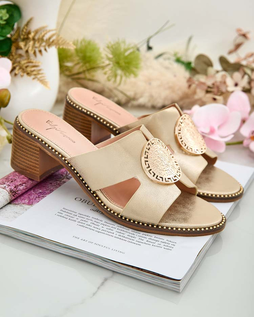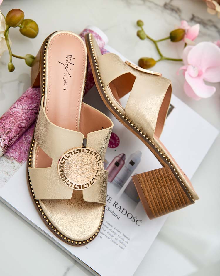 • Išryškinkite savo vasaros stilių ir mėgaukitės patogumu su šiomis žemakulnėmis basutėmis. Jų dirželis, puoštas aukso elementu, suteikia elegantiškumo ir nepakartojamo žavesio. Pagamintos iš ekologiškos odos, šios šlepetės - puikus pasirinkimas vasaros die