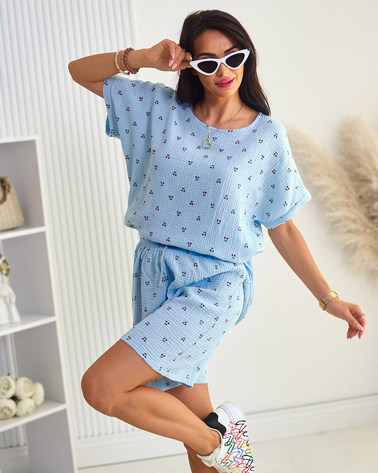 - Moteriškas komplektas pagamintas iš malonios medžiagos. Modelis turi dekoratyvų raštą. Palaidinė trumpomis rankovėmis ir trumpi šortai su elastiniu juosmeniu. Pajuskite vasarą vilkėdama šį nuostabų komplektą!