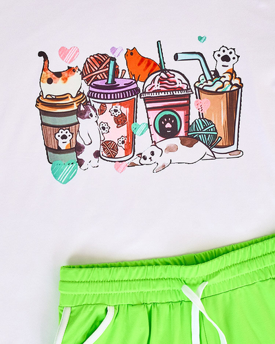 - Moteriškas komplektas iš malonios medžiagos. Modelis turi dekoratyvų raštą. Palaidinė trumpomis rankovėmis ir trumpi šortai su elastiniu juosmeniu. Pajuskite vasarą vilkėdama šį nuostabų komplektą!