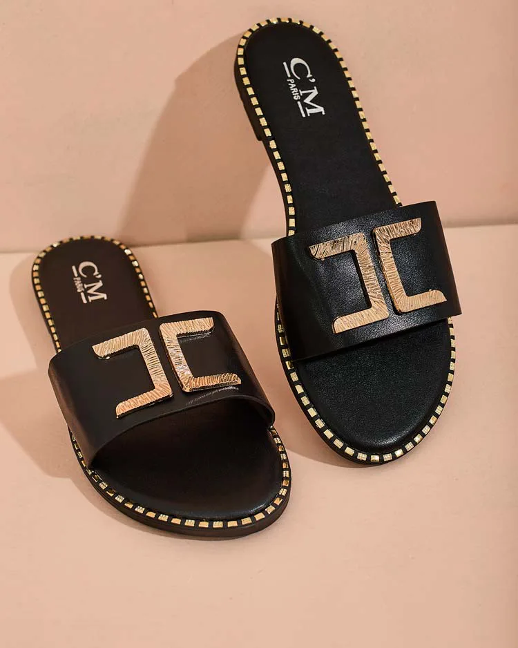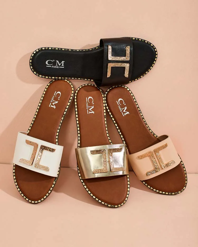 - Puikios moteriškos plokščiapadės šlepetės. Pagamintos tik iš ekologiškos odos. Jos turi subtilų papuošimą ant batviršio. Puikus pasirinkimas atostogoms!