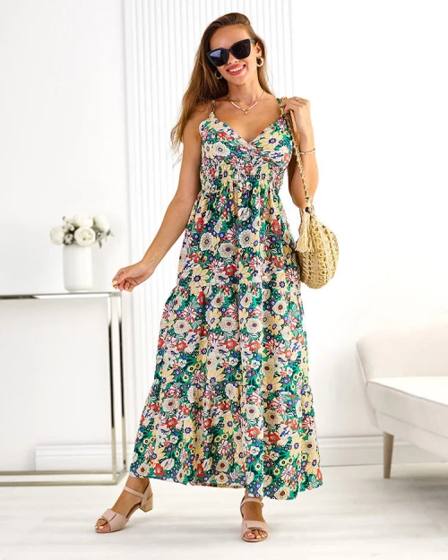 • Raštuota moteriška midi ilgio suknelė, pasiūta iš malonaus medvilninio audinio. Modelis su reguliuojamomis petnešėlėmis, su V formos iškirpte ir elastingu liemens pločiu. Dėvėkite ją su sandalais! PASTABA: matavimų tikslumas (+/-) 1 cm.