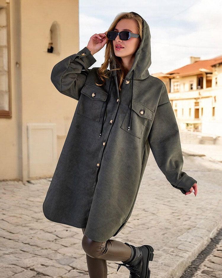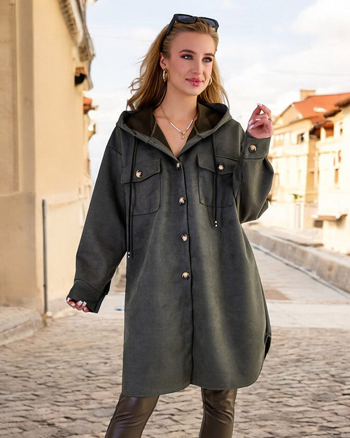 • Stilingas moteriškas paltas a'la marškiniai. Sukirptas virš dydžio modelio, jis yra ilgomis rankovėmis ir su gobtuvu su užrišamais raiščiais. Paltas užsegamas sagomis. Šonuose prisiūtos dvi kišenės. Puikiai tiks šiam rudeniui!