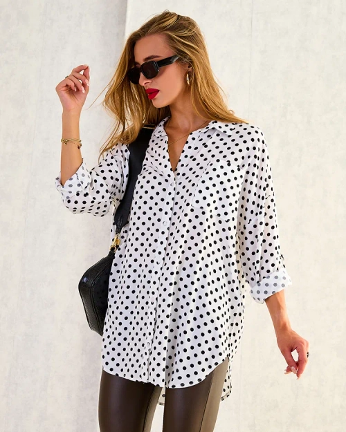 - Sensacingi moteriški marškiniai su taškeliais ir užlenkiamomis rankovėmis. Modelis su apykakle, užsegamas sagomis. Turi būti kiekvienos moters spintoje!
