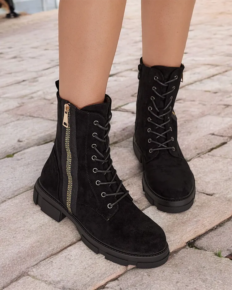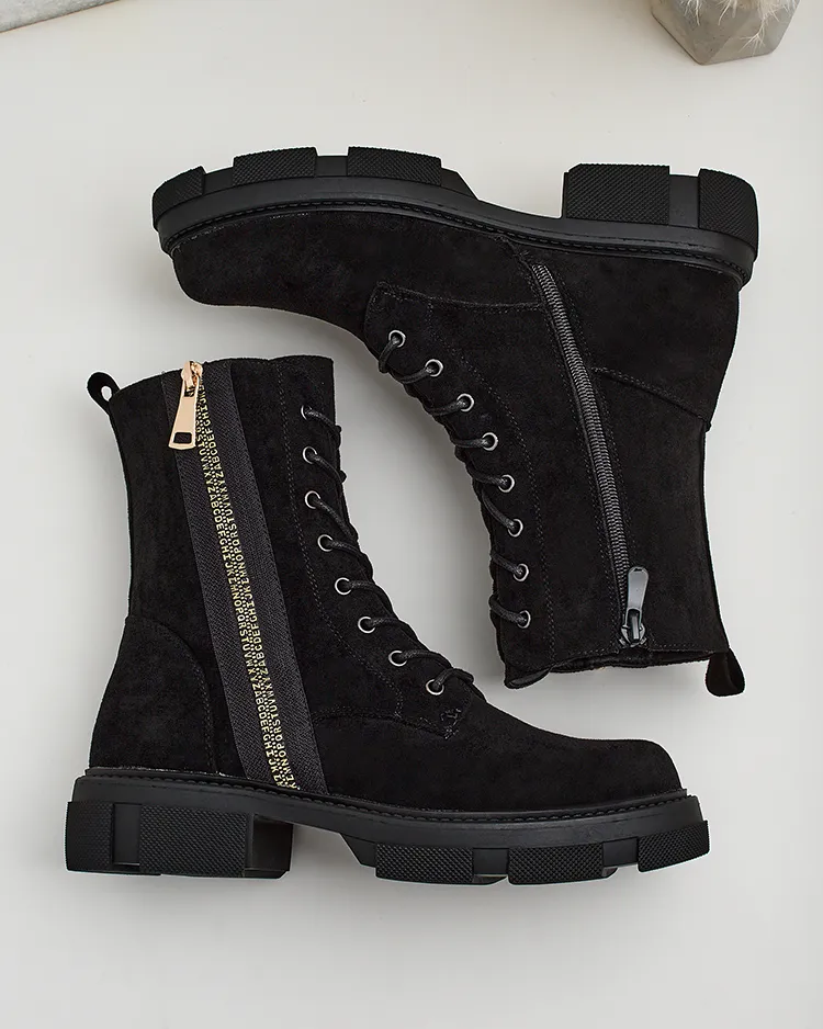 - Stilingi batai iš ekologiškos odos. Batai yra su raišteliais ir užtrauktukais, turi storesnį guminį padą ir kailinį užpildą. Puikiai tinka rudeniui!