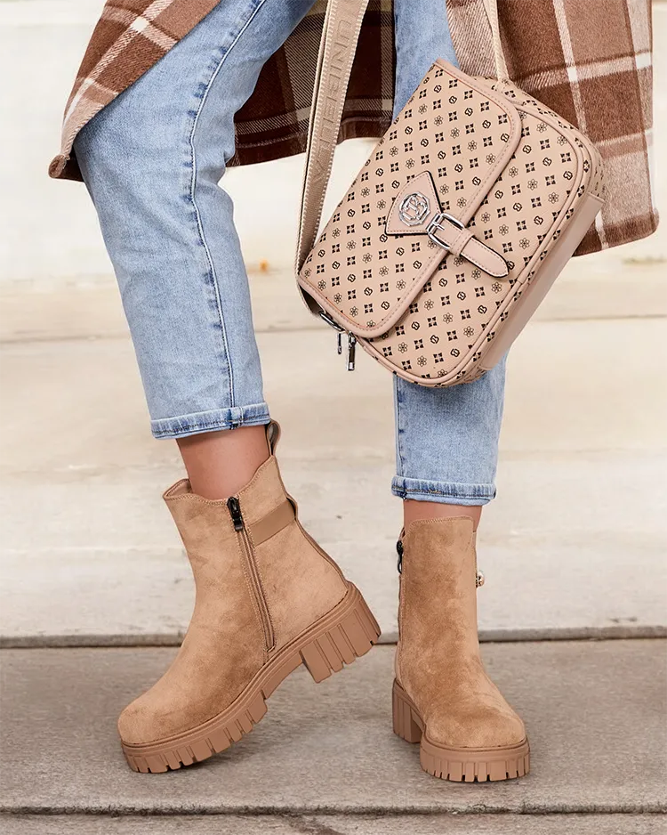 - Klasikiniai moteriški batai storesniu padu. Viršutinės dalies medžiaga - eko zomša, viduje - minkštas kailis. Modelis užsegamas užtrauktuku, turi subtilų papuošimą ant batviršio. Puikus pagrindas daugeliui kasdienių įvaizdžių!