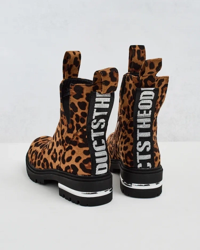 - Stilingi moteriški plokščiapadžiai batai, pagaminti iš minkštos ekovatos. Gaminys apšiltintas minkštu kailiuku ir papuoštas juostele su užrašais. Modelio viduje yra užtrauktukas.