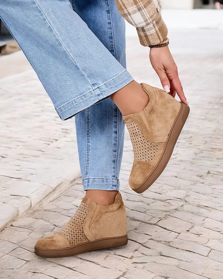• Madingi moteriški sportiniai bateliai ant paslėpto inkaro, pagaminti iš ekologiškos zomšos. Viduje minkštas eko odos vidpadis. Įsispiriami bateliai, puošti cirkonais. Jie bus puiki kasdienio stiliaus puošmena.
