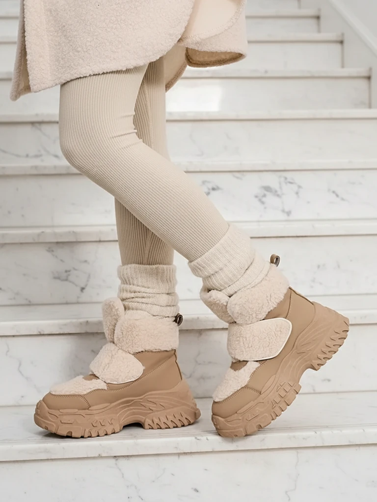 - Nesenstantys moteriški sniego batai. Viršutinė dalis pagaminta iš ekologiškos odos su įdėklais a'la avikailis. Viduje - kailio formos apšiltinimas, batai užsegami velcro užtrauktuku. Idealiai tinka šaltajam sezonui!
