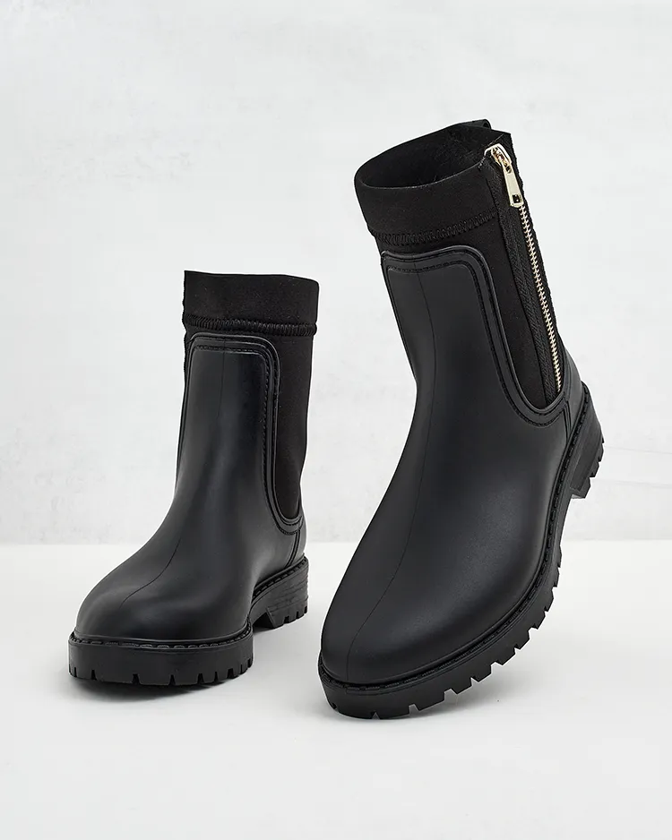 - Klasikinės moteriškos basutės plokščiu kulnu iš guminės medžiagos. Viduje yra medžiaginis vidpadis. Jie turi dekoratyvinį užtrauktuką. Idealiai tinka rudens lietingoms dienoms!