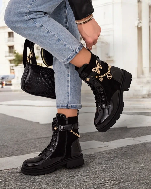 - Stilingi darbiniai batai, pasiūti iš ekologiškos zomšos ir lakuotos odos derinio. Batai yra su raišteliais ir užtrauktukais, turi storesnį guminį padą ir minkšto kailio užpildą. Modelį puošia nuimamas auksinis ornamentas. Puikiai tinka rudeniui!