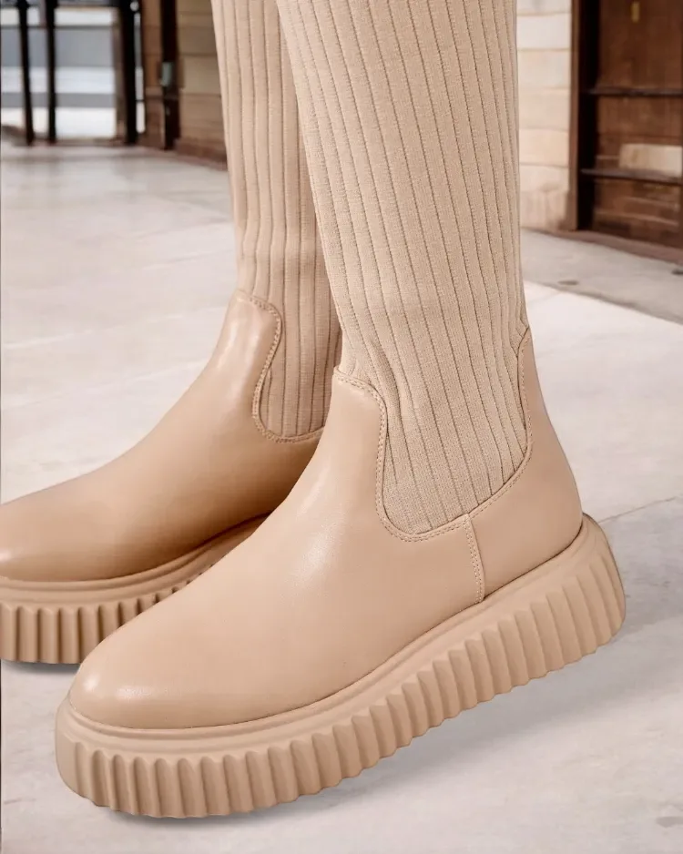 • Stilingi moteriški batai virš kelių storesniu padu. Batų viršus pagamintas iš elastingos briaunuotos medžiagos ir turi eko odos intarpus. Kailinis vidpadis. Slystantis modelis.