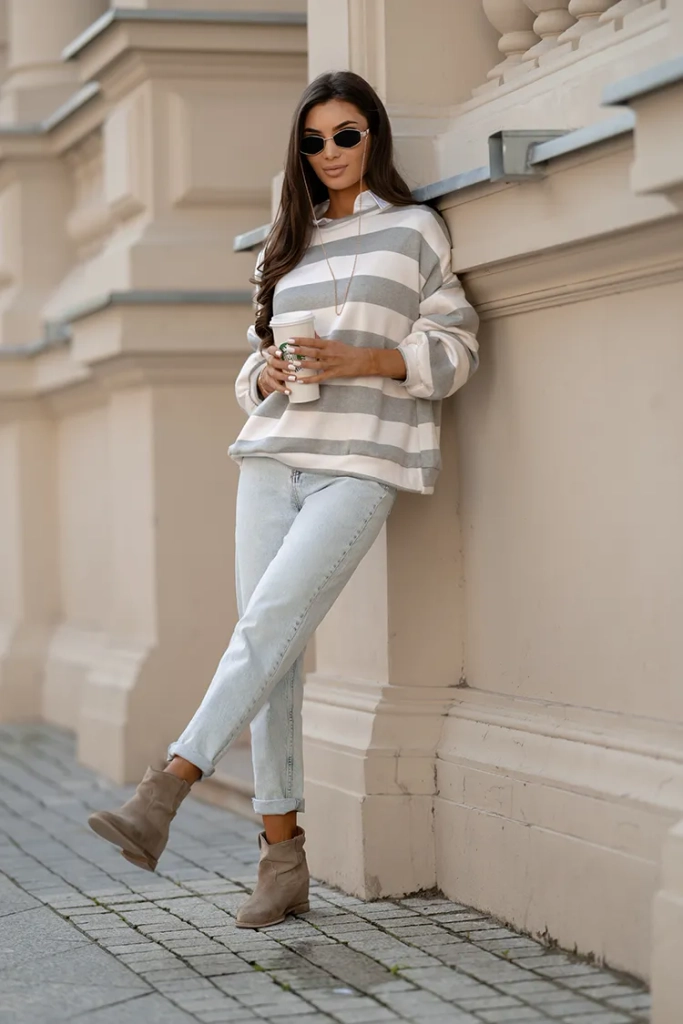- Moteriškas megztinis apvalia iškirpte, pasiūtas iš malonaus audinio, dryžuoto rašto. Modelis yra ilgomis rankovėmis. Puikus žiemos aprangos pagrindas!