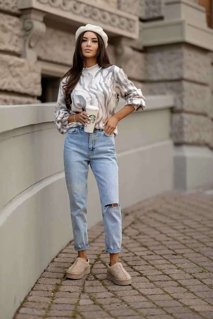 - Moteriškas megztinis su apvalia iškirpte, pasiūtas iš malonaus audinio su spauda. Modelis yra ilgomis rankovėmis. Puikus žiemos aprangos pagrindas!