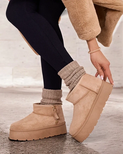 - Puikūs moteriški žieminiai platforminiai sniego batai. Batų viršus pagamintas iš organinės zomšos odos, vidurys apšiltintas kailiu. Modelis turi dekoratyvinį užtrauktuką. Idealus pagrindas žiemai!