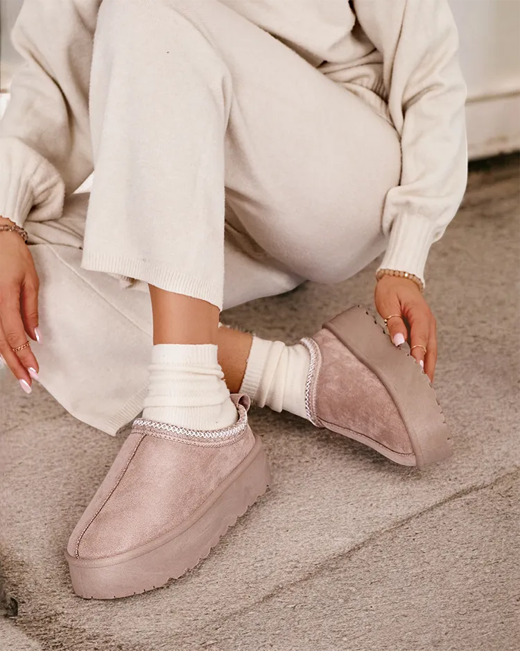 - Puikūs moteriški žieminiai sniego batai su platforma. Batų viršus pagamintas iš organinės zomšos odos, vidurys apšiltintas kailiu. Puikus pagrindas žiemai!
