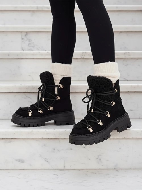 • Moteriški sniego batai, kurių batviršis pagamintas iš eko zomšos odos ir a' la avikailio medžiagos derinio. Viduje pamušalas su kailiu, batai suvarstomi ir suvarstomi raišteliais. Puikiai tinka žiemai!