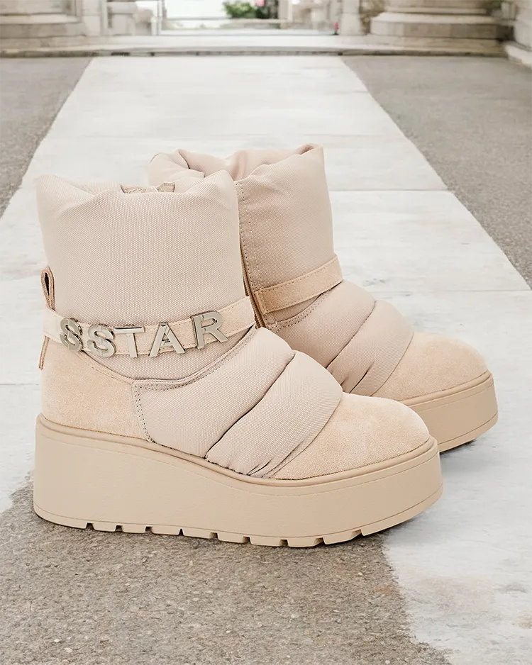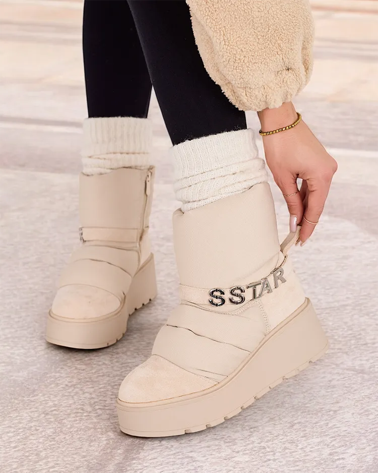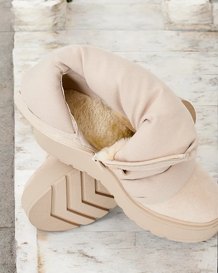 - Moteriški sniego batai, kurių viršutinė dalis pagaminta iš zomšos, eko odos ir audinio medžiagos derinio. Malonus kailis viduje, įsispiriama ir užsegama užtrauktuku avalynė. Puikiai tinka žiemai!