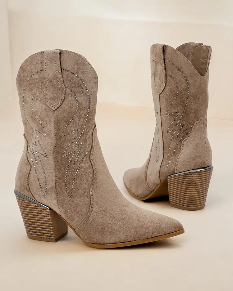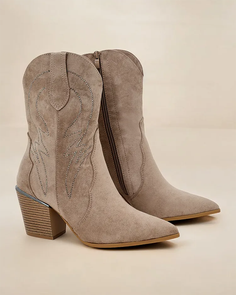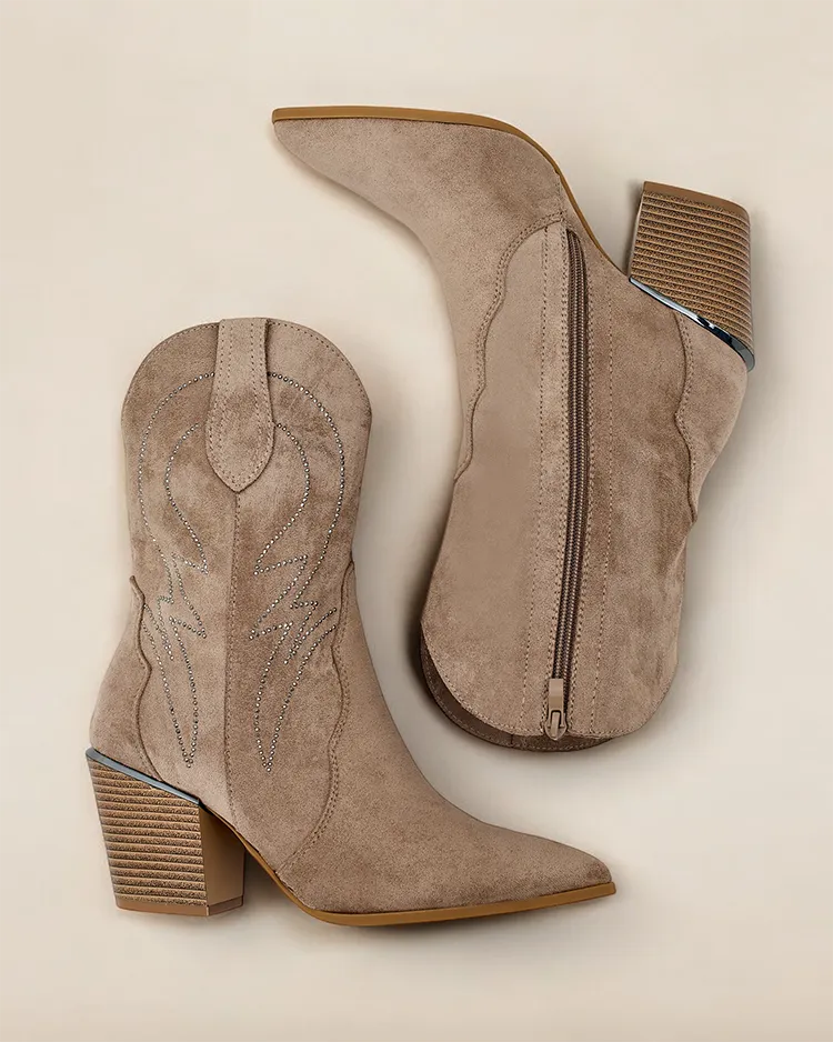- Kovbojų stiliaus batai ant kulnų, pagaminti iš ekologiško oda panašaus audinio. Eko odos įdėklas, apatiniai palmikai, puošiami cirkonais. Tinkami daugeliui moteriškų stilių!