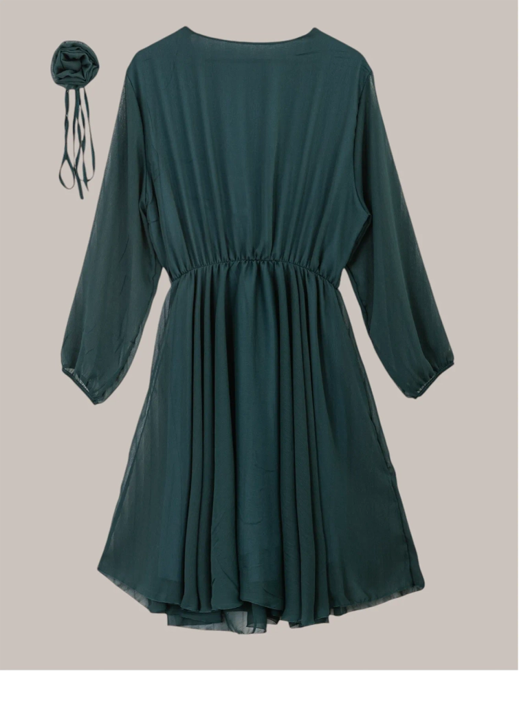 - Elegantiška, amžina kelių ilgio moteriška suknelė su užsegamu kaklo atlošu ir elastine juosmenėle. Suknelė turi ilgas rankoves iš tinklinio audinio ir papuošimo papildomu pakabinimu su gėlėmis. Puikus pasirinkimas vakarėliui!