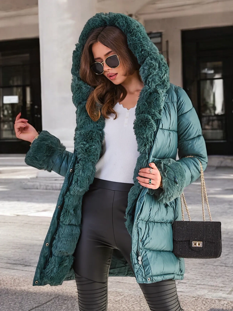 • Moteriškas pamuštas žieminis paltas su kauku ir atnaikinamu kailiu. Modelis užsegamas su užtrauktuku ir sagomis, turi 2 kišenės ir drapanės, kad pabrėžtų liemenį. Idealu vėsesniems dienoms!
