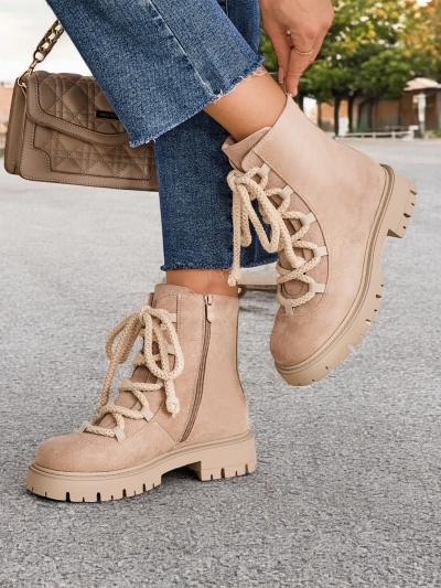 - Stilingi darbinio tipo viršutinės batai, pagaminti iš dirbtinės veliuro odos. Batai yra auliniai, su užtrauktuku uždarymui. Modelyje yra storesnė padų dalis ir kailiškas apdaila. Puikiai tinka rudeniui!