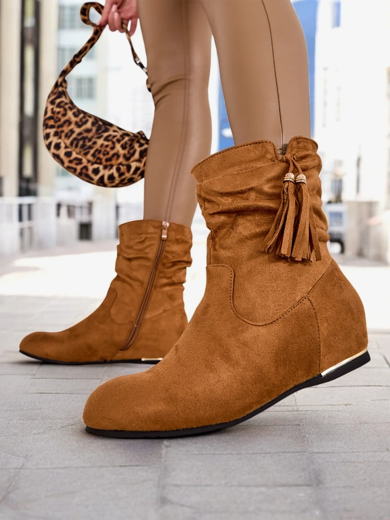 • Stilingi samtiniai batai pagaminti iš ekologiško samto odos. Batuose yra paslėptas kulnas viduje. Modelis užsegamas šonuose esančiu užtrauktuku. Bato aukštyje yra dekoratyvinis kailinukas. Puikiai tinka daugybei moteriškų stiliacijų.