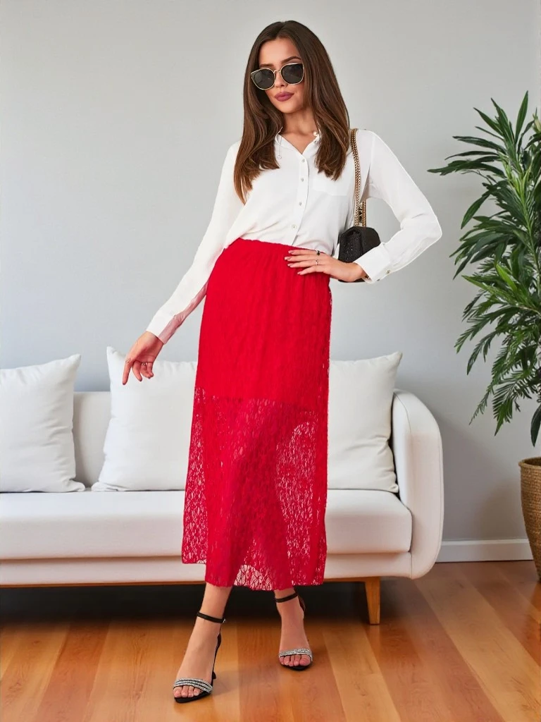 - Moteriškas vidutinio ilgio sijonas pagamintas iš lengvo audinio. Modelis su pamušalu ir išoriniu nerto sluoksniu, su elastinga juosmens juosta. Puikiai tinka rudens sezonui! PASTABA: Matavimo tikslumas (+/-) 1 cm.