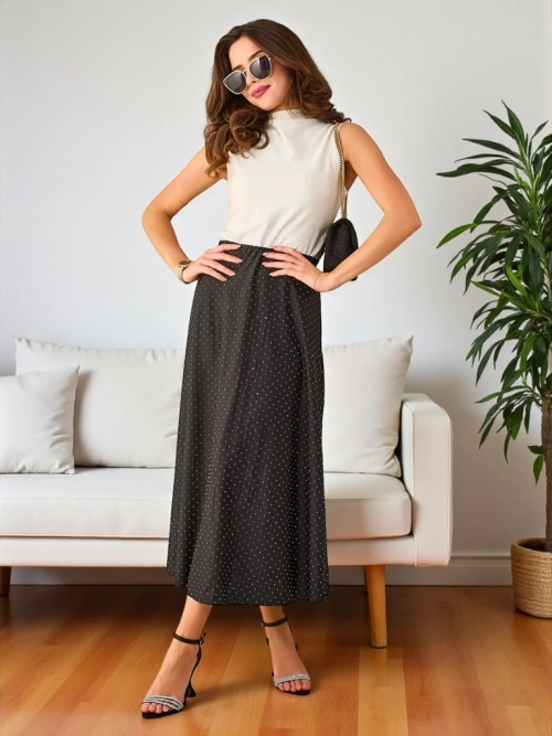 - Moteriška vidutinio ilgio sijono pagaminta iš minkšto audinio. Modelis dekoruotas visame ilgime su blykstėmis. Puikus pagrindas daugybei unikalių aprangų! PASTABA: Matavimo tikslumas (+/-) 1 cm.