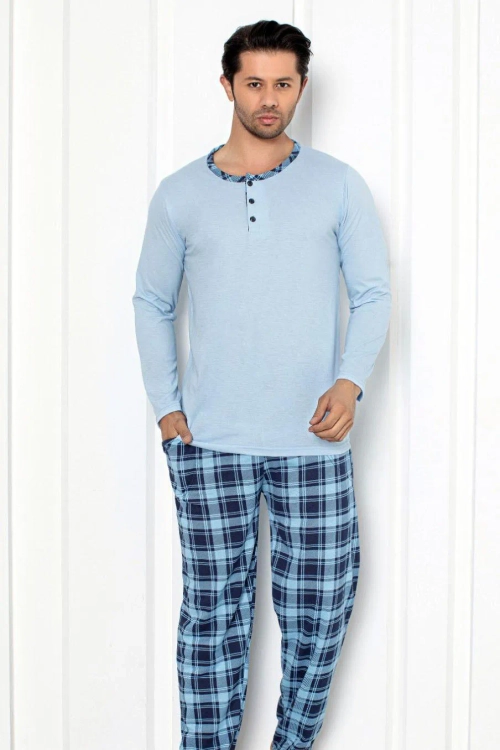 - Išskirtinės vyrų pižamos, pagamintos iš medvilnės. Modelis turi ilgus rankovės, dvi kišenes ir ilgas kelnes. Patogumas ir elegancija viename!
