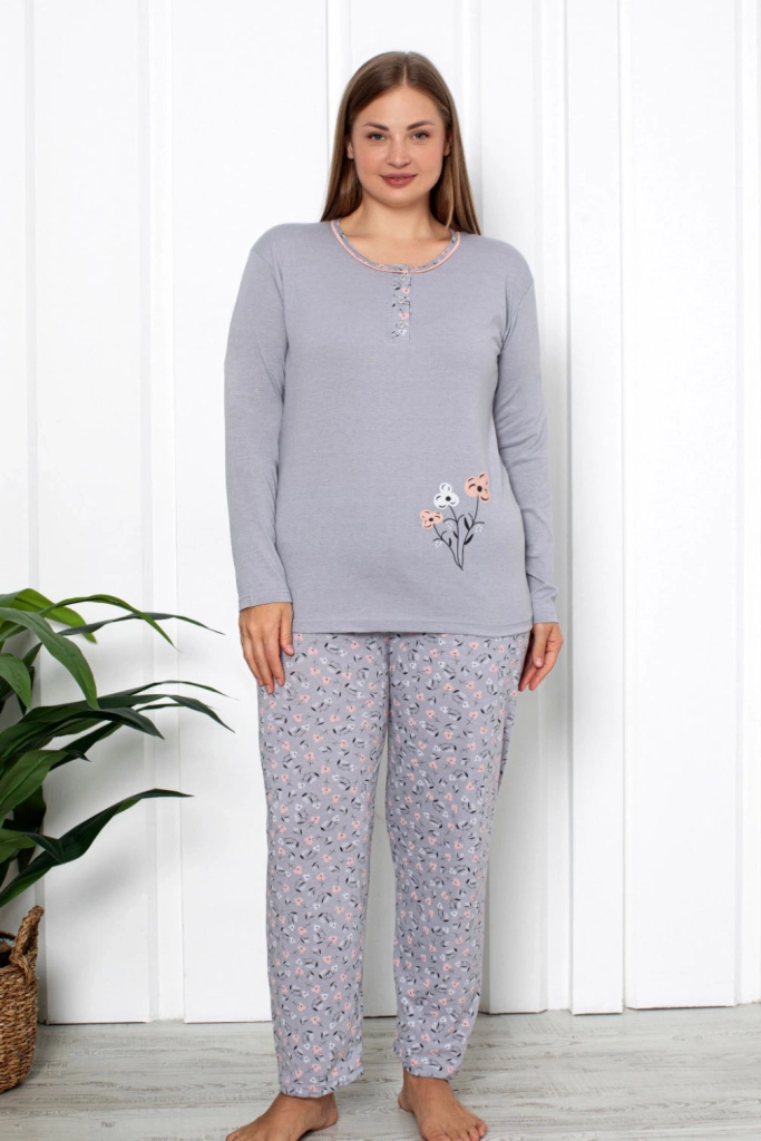 • Moterų 2 dalių pižama pagaminta iš medvilninio audinio, dekoruoto spauda. Rinkinį sudaro ilgomis rankovėmis bluzonas su mygtukais ir kelnės su elastine juosta ir tiesiomis kojinėmis.