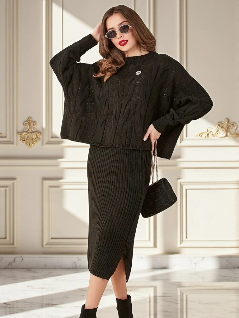 - Moteriškas rinkinys pagamintas iš malonaus audinio. Megztinis su ilgomis rankovėmis ir apvaliu iškirptė. midi sijonas, aprūpintas elastingu liemeniu. Puikus žieminis stiliavimas! PASTABA: Matavimo tikslumas (+/-) 1 cm.