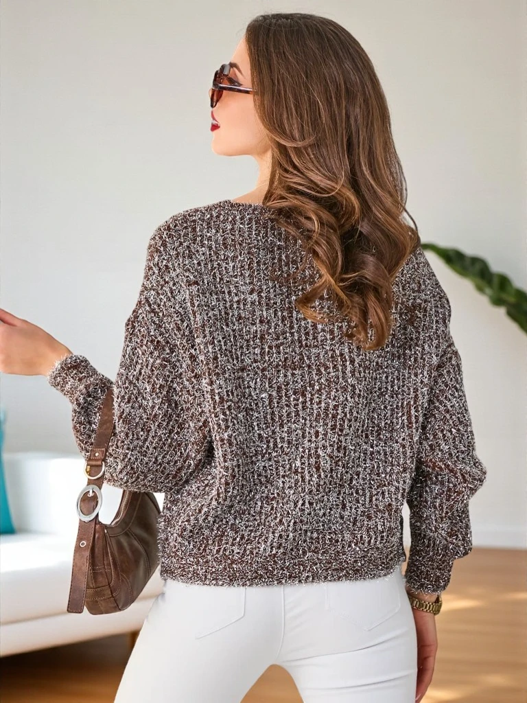 - Šis stilingas megztinis yra komforto ir žavesio esmė. Pagamintas iš minkštos medžiagos, megztinis turi V formos iškirpimą ir ilgomis rankovėmis. Laidūs siluetas ir blizgi siūlė suteikia jam unikalų žavesį!