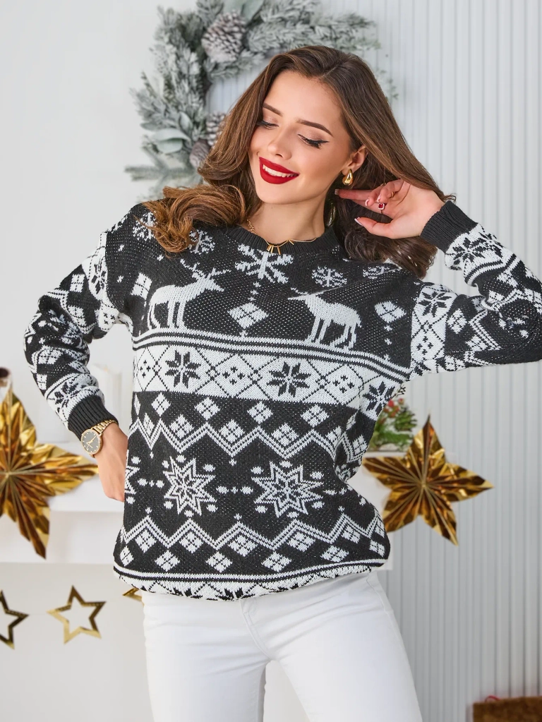 - Šis unikalus megztinis yra komforto ir žavesio esmė. Pagamintas iš minkštos medžiagos, megztinis turi apvalų iškirpimą ir ilgus rankovės. Šventinis raštas suteikia jam išskirtinį žavesį!
