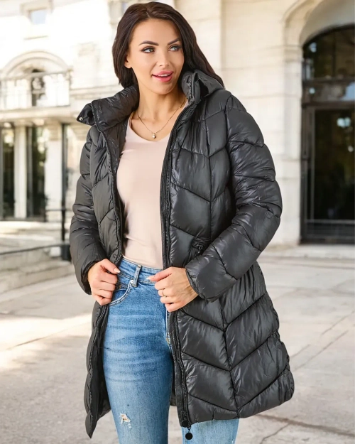 - Šiltas moterų iki kelių ilgio žiemos paltas su nuimamu gobtuvu. Dublikuotas modelis, turi 2 užtrauktukais užsegamas kišenes ir užtrauktuko uždarymą. Avalynė viduje yra kailiu ir turi dirbtinio pūko užpildą. Idealiai tinka vėsesniems dienoms!